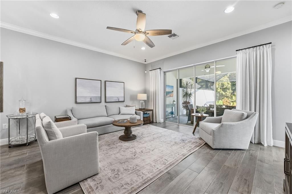 Located in the desirable Riverside Avenue Villas and just minutes from shopping, dining, and the beautiful Gulf beaches, this impeccably maintained 3 bedroom 2 full bath pool residence offers the perfect blend of comfort, style, and thoughtful upgrades.Step inside to discover a beautifully appointed chef's kitchen featuring quartz countertops, classic subway tile backsplash, under-cabinet lighting, and 42-inch white shaker-style cabinetry, complemented by premium Bosch appliances. Tile flooring flows seamlessly throughout the home, enhancing both durability and elegance. The open and inviting layout is accented by 8-foot doors, plantation shutters, and dimmer switches throughout, allowing you to create the perfect ambiance in every space.Both bedrooms serve as private ensuites, offering comfort and privacy for residents and guests alike. The spacious primary suite features direct access to the lanai and a beautifully designed bath with dual quartz vanities, custom lighting, a walk-in shower, and a private water closet. The second bedroom also enjoys its own ensuite bath, complete with a walk-in shower featuring floor-to-ceiling subway tile and a seamless glass enclosure. A versatile den tucked at the front of the villa provides the perfect space for a home office, reading room, or additional guest area.Outdoor living is equally impressive. The saltwater pool creates a private retreat, while the expanded pool deck offers plenty of room for entertaining and relaxing. The pavers have been meticulously maintained and sealed annually since ownership. The driveway has also been widened by two feet for added convenience.Additional highlights include all impact windows and doors, custom closets by Closet Concepts, an expanded pool deck, and a spacious laundry room with storage and sink. The garage features extra storage and a durable epoxy-finished floor.This exceptional villa offers a rare opportunity to enjoy low-maintenance living with upscale finishes in an unbeatable location. Don't miss the fabulous walk through video!