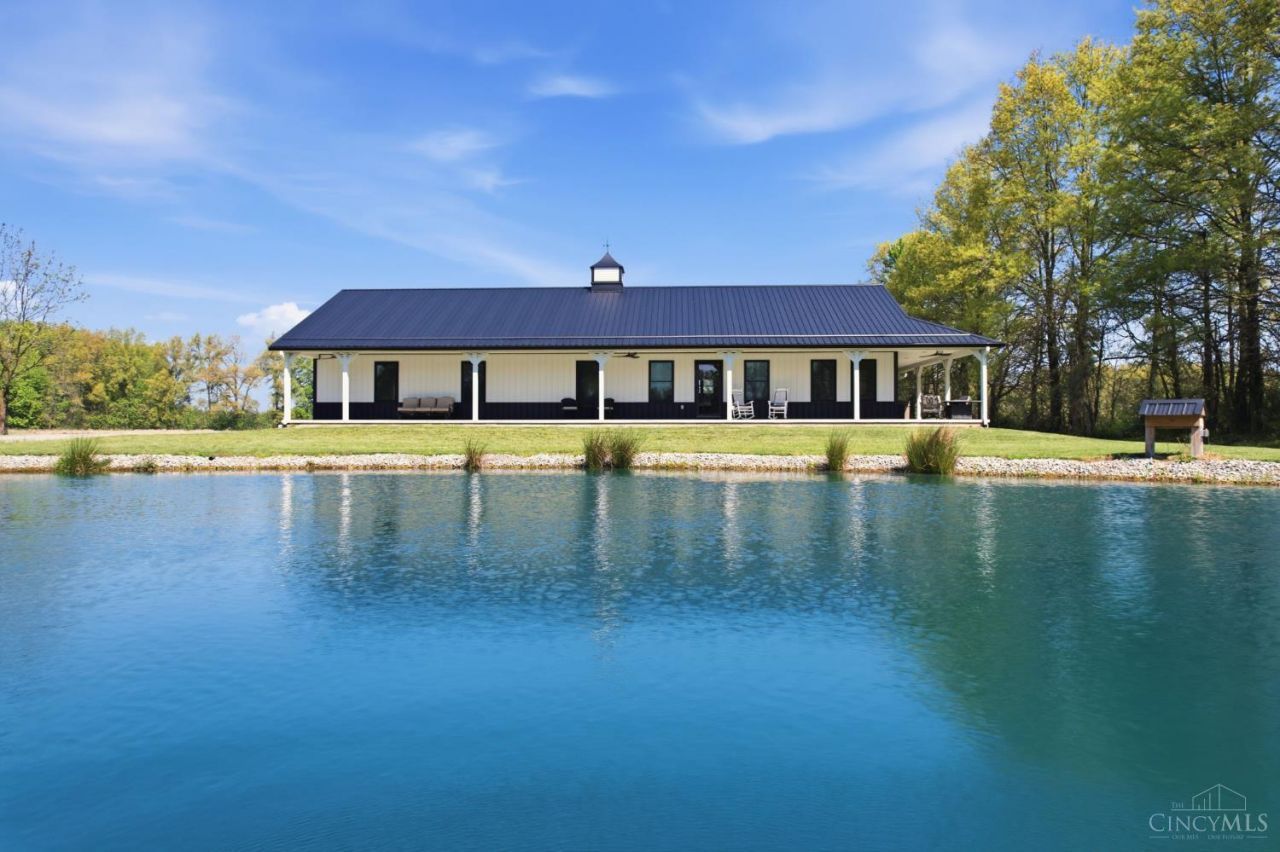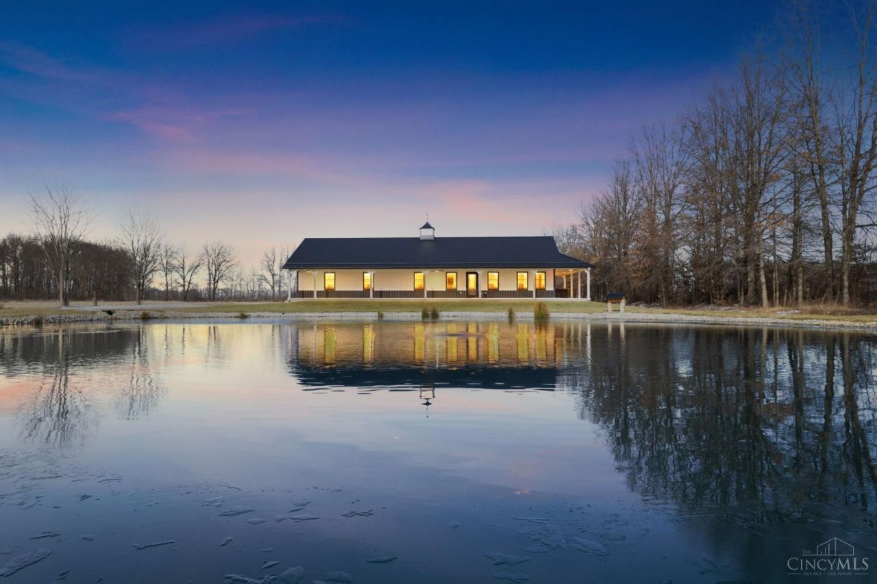Situated on 6 private, usable acres in Blanchester, this newly STICK BUILT, custom ranch offers exceptional craftsmanship with no expense spare. The open concept design features beautiful wood flooring throughout, soft close kitchen cabinetry, stainless appliances, and stunning quartz counter tops. The spacious primary suite includes a luxurious marble walk in shower, double vanity, private water closet, his and her closets, and walk-out access to a wrap around porch and private hot tub. Enjoy breathtaking views from the unmatched front porch overlooking a fully stocked and aerated pond. Relax on the covered back porch with views of the 2nd pond, surrounded by peaceful nature. The front barn is fully heated and cooled and offers the potential for a complete second living quarters (ADU) with full kitchen, laundry room, and full bath. Also ideal space for home business,any hobby, or entertaining. This one of kind property delivers luxury, versatility, and serene country living.