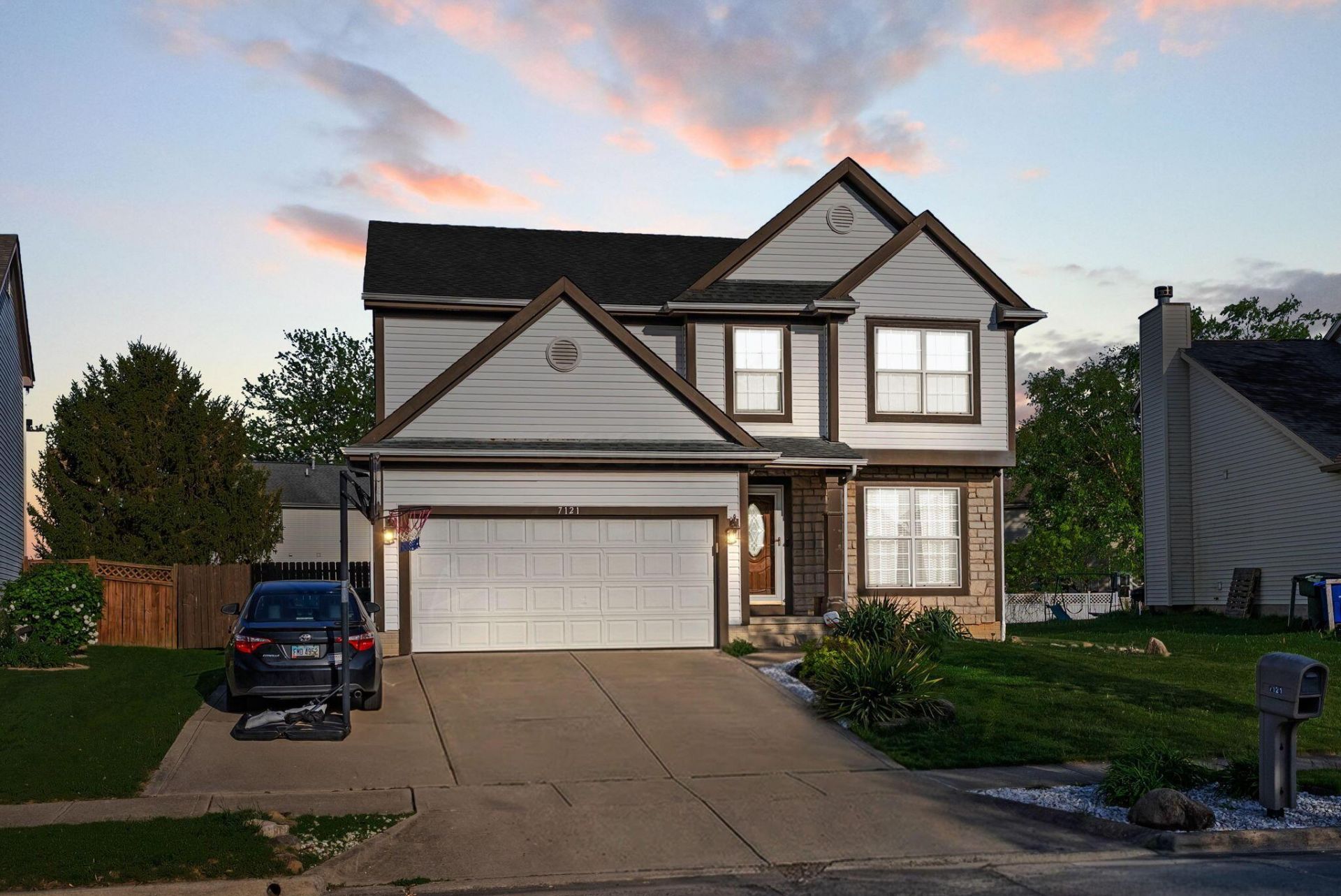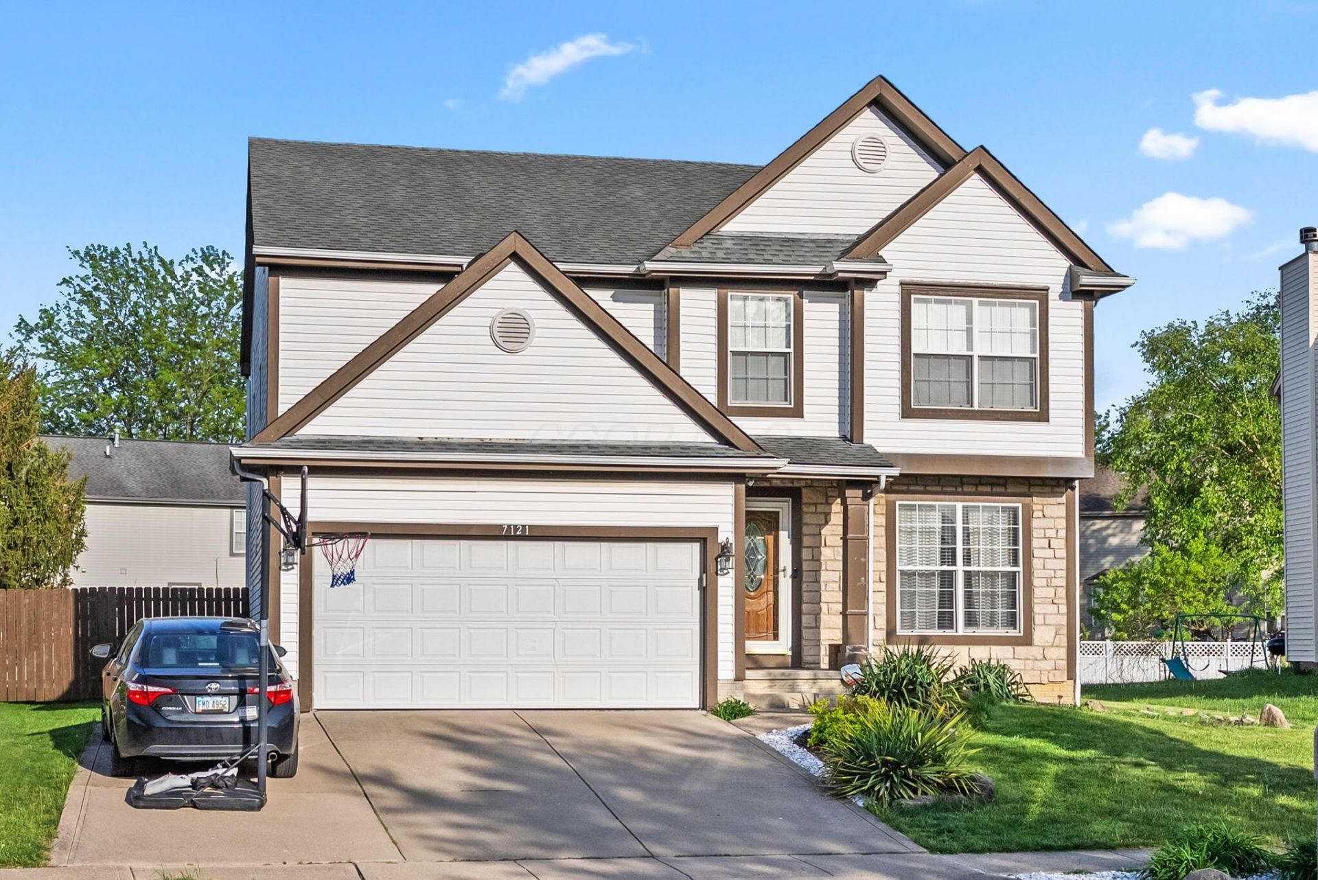 Welcome to 7121 Bennell -- a spacious 4-bedroom home with a 2-car attached garage, two full baths and two half baths. Reynoldsburg address with Pickerington schools. Enjoy the convenience of a second-floor laundry room. The fully renovated primary bath features a jetted tub with a waterfall faucet and a separate walk-in spa shower with multi-function jets and a rainfall showerhead. Recent updates include a new furnace (2022) and AC serviced in 2025. The first floor offers a mix of hardwood and carpet. The kitchen has white cabinets, granite countertops, and stainless-steel appliances, adjacent to a casual eat-in area. Additional living space includes a formal dining room, a living room, and a family room overlooking a gas fireplace. Outside, the fenced backyard includes a deck and a shed -- perfect for outdoor entertaining and storage.