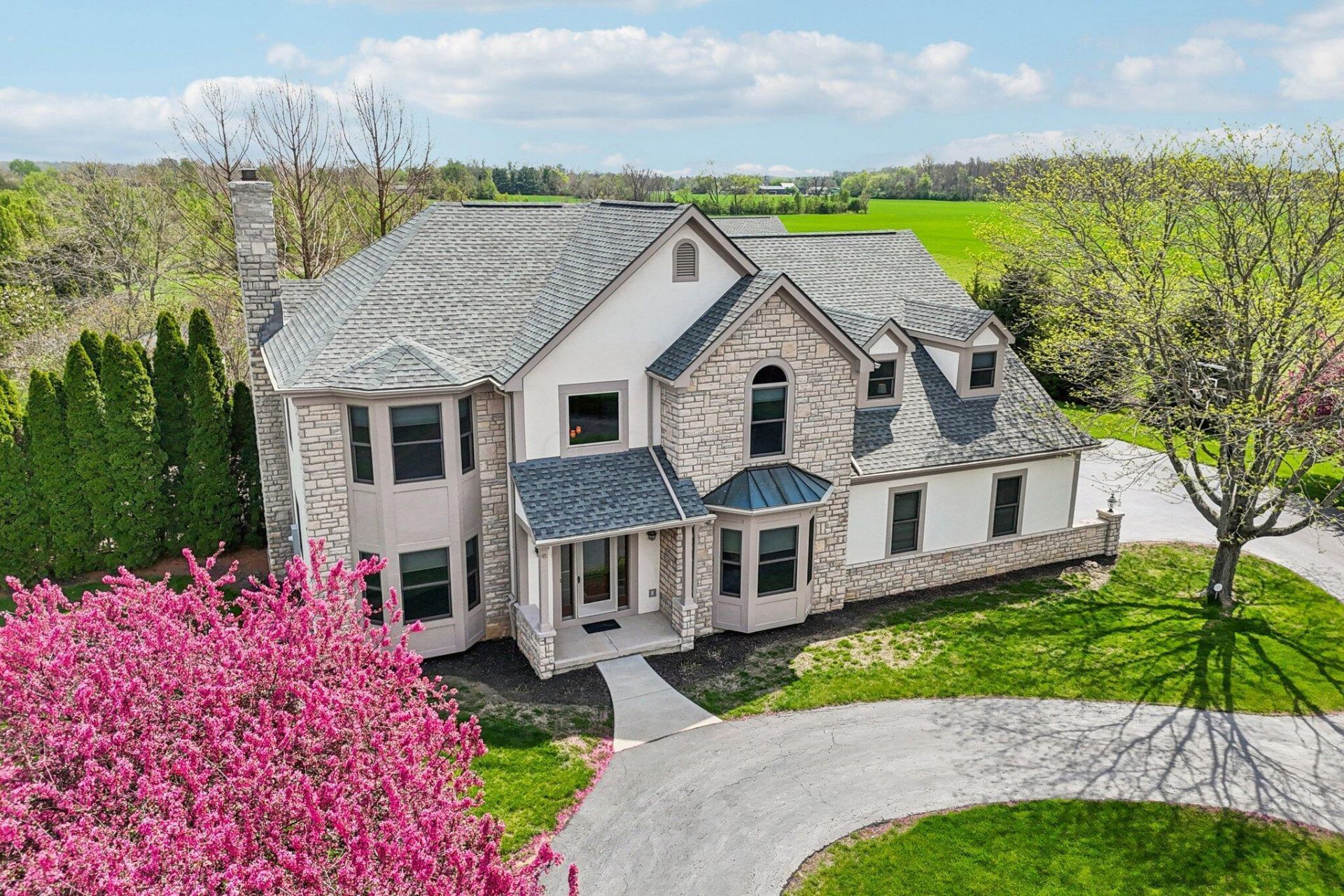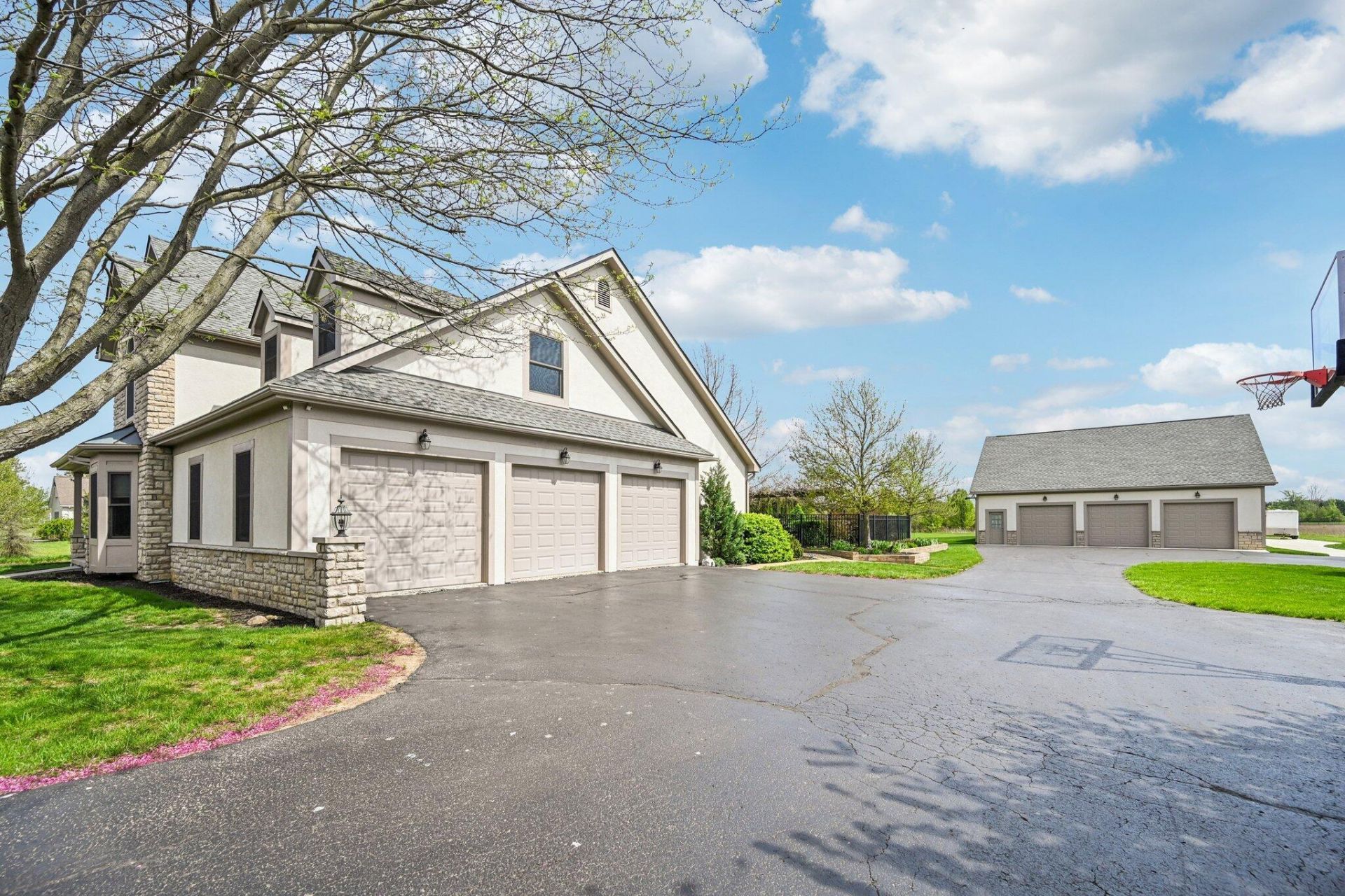Welcome to this exceptional custom-built home set on 5.39 private, professionally landscaped acres in the highly sought-after Hilliard City School District. A grand circular driveway welcomes you to a peaceful setting where the home offers 4 bedrooms, 3 full baths, and 3,740 sqft of well-appointed living space. Inside, you'll find a striking stone fireplace, Amish Miller cabinetry, and a well-designed kitchen featuring a new wall oven. The spacious primary suite includes a walk-in closet with a bonus room and a private balcony overlooking the pool, perfect for relaxing or tanning. Additional highlights include geothermal heating, propane emergency backup, dual-zone HVAC, reverse osmosis filtration, and high-capacity electrical, along with a new roof (2024) on all three buildings. Designed for both relaxation and entertaining, the outdoor space includes a heated in-ground pool (3-8 ft) and a fully equipped pool house with a half bath/changing area and storage. A screened-in patio with built-in speakers, ambient lighting, and two ceiling fans creates the perfect place to unwind. The property also features an oversized 3-car attached garage and a rare standout 40' x 110' heated and insulated detached garage with 400 AMP service, walk-up attic, and bar area, offering endless possibilities. Located just minutes from Prairie Oaks Hiking Trails and Metro Parks, this property offers a truly private and peaceful lifestyle with convenient access to everything Hilliard has to offer.